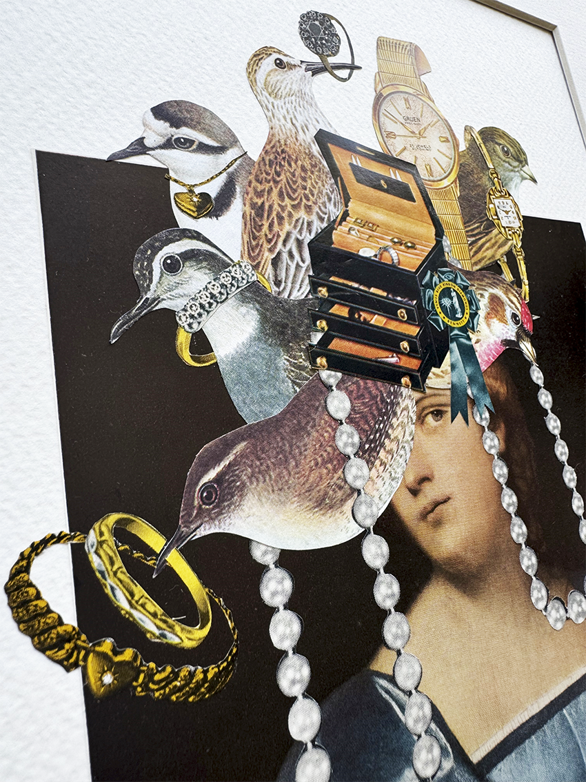 This collage is made from original illustrations from recycled vintage magazines and books. The images have been cut out and glued onto art board.