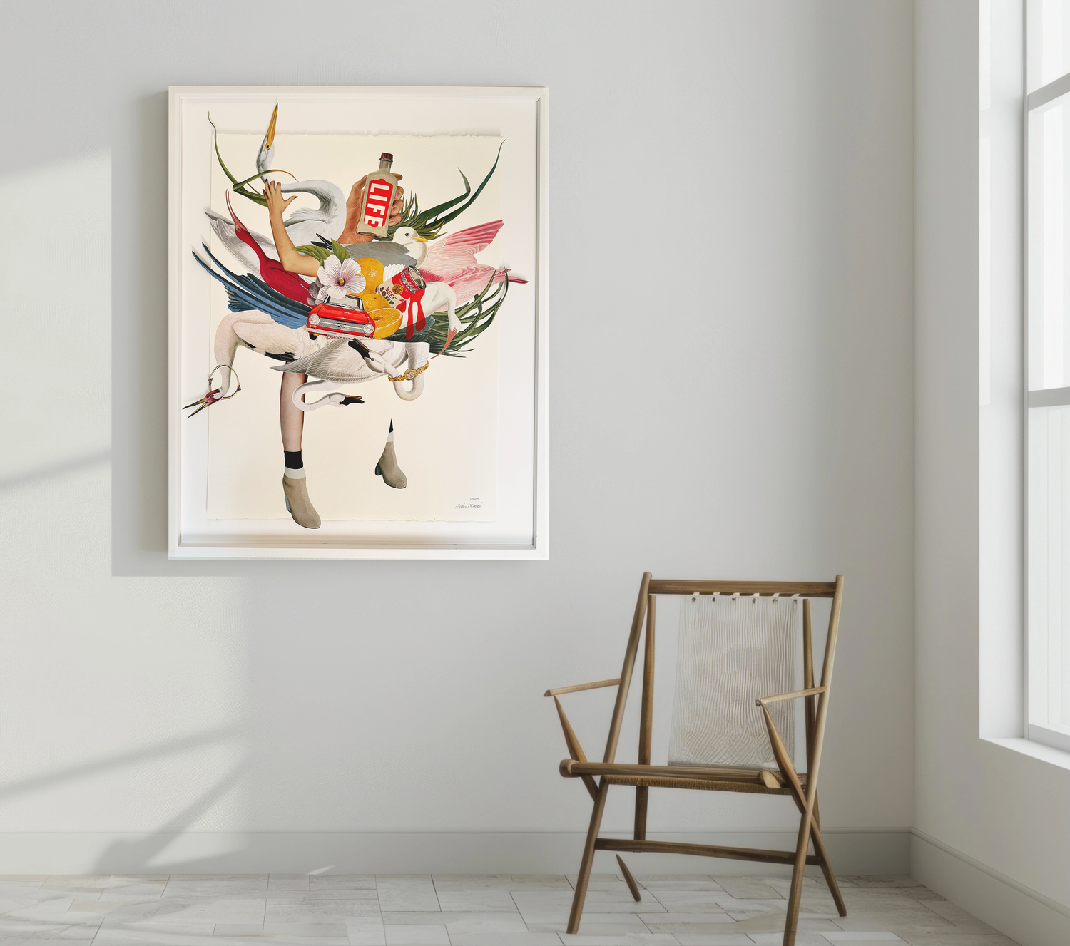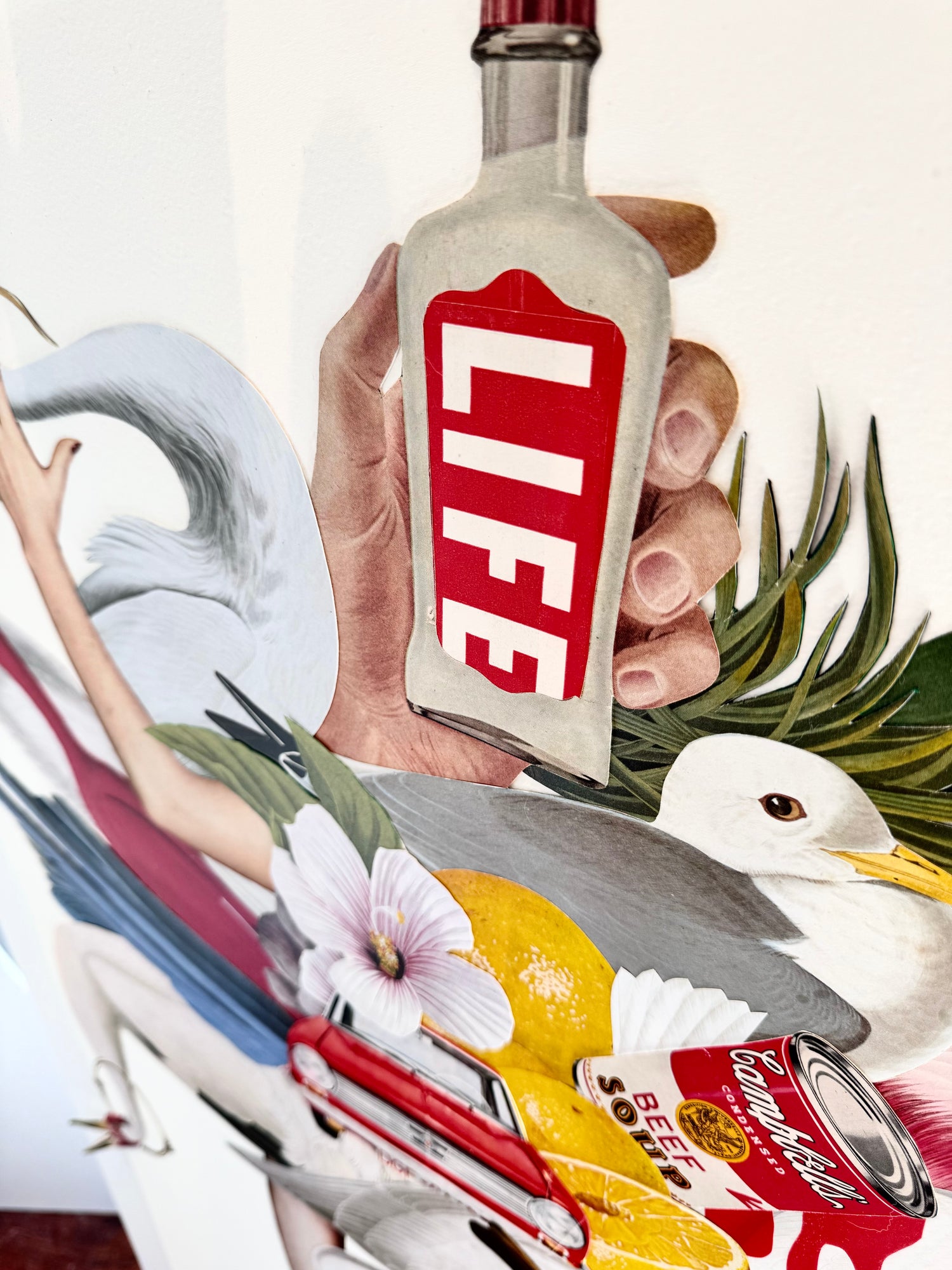 The collage is made using the traditional cut-and-paste collage technique with images from vintage magazines and recycled book illustrations.