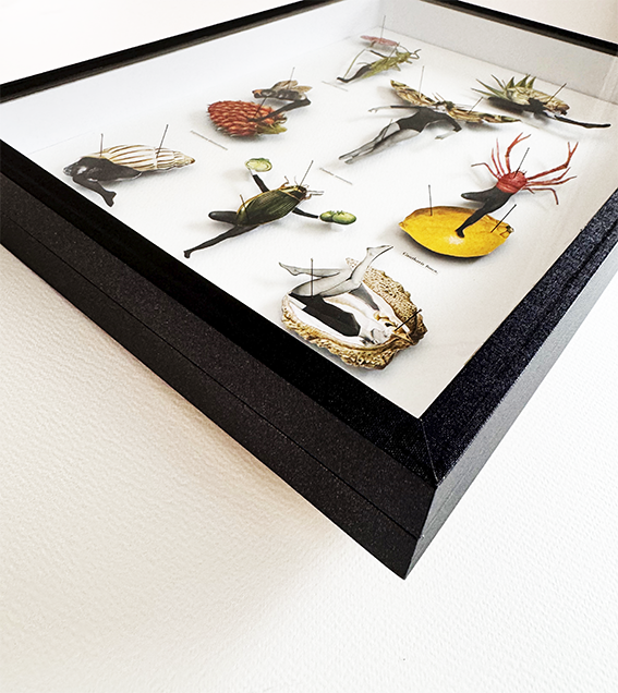 The Humanbugs are attached with hot glue and pins inside a black insect display case with glass.