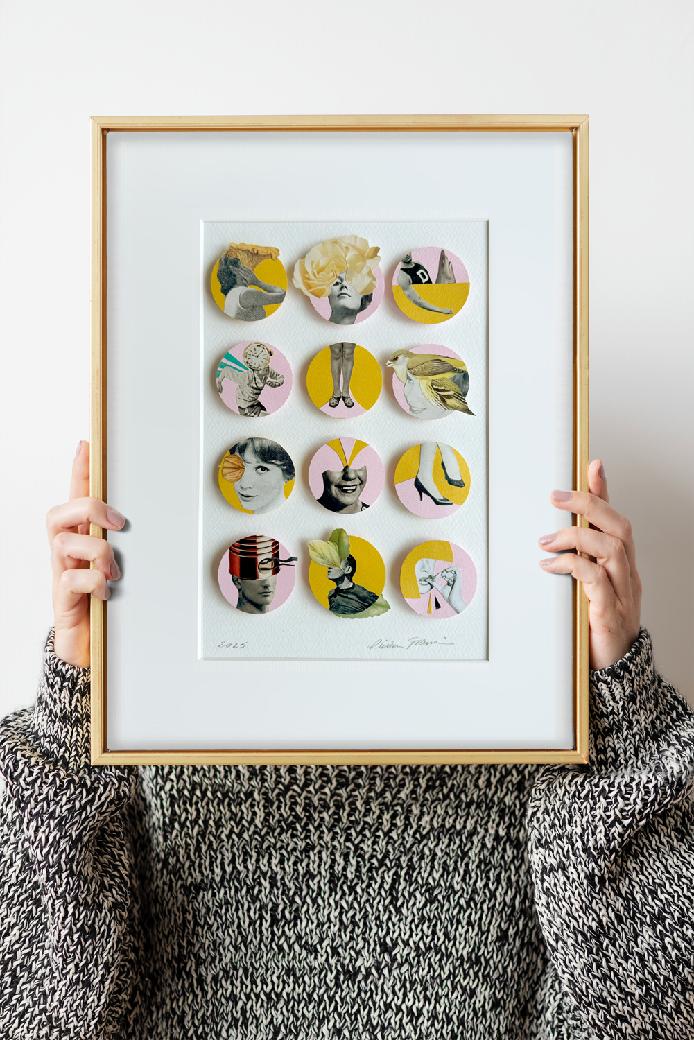 This collage is made using the traditional cut-and-paste collage technique with images from vintage magazines and recycled book illustrations. The piece is one-of-a-kind, a unique composition made from original old vintage materials.