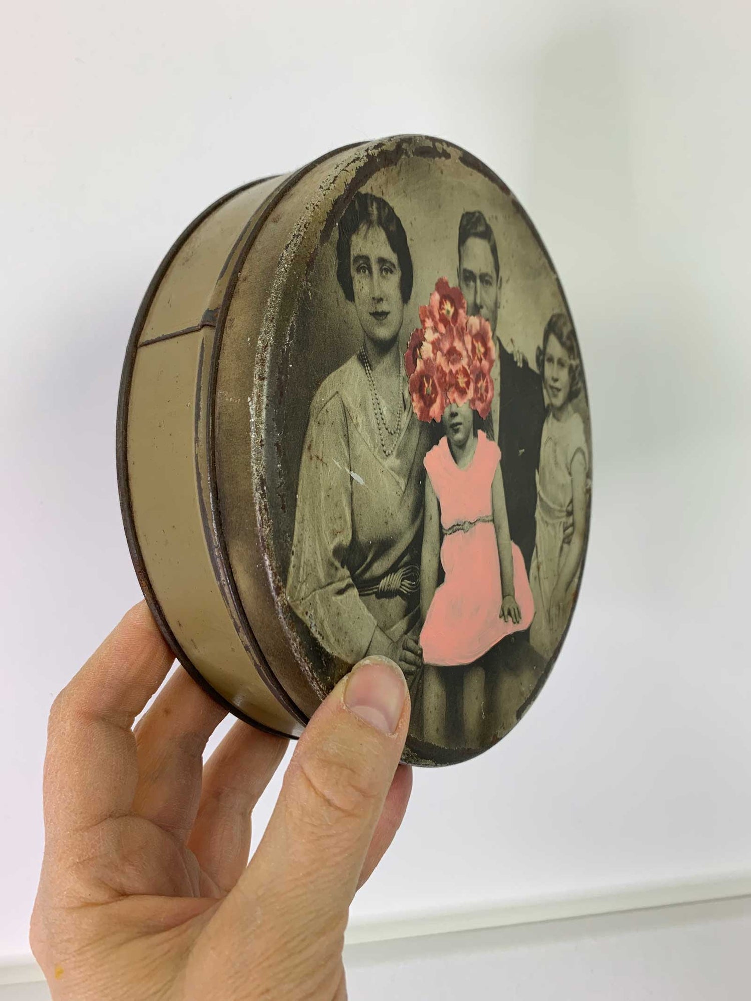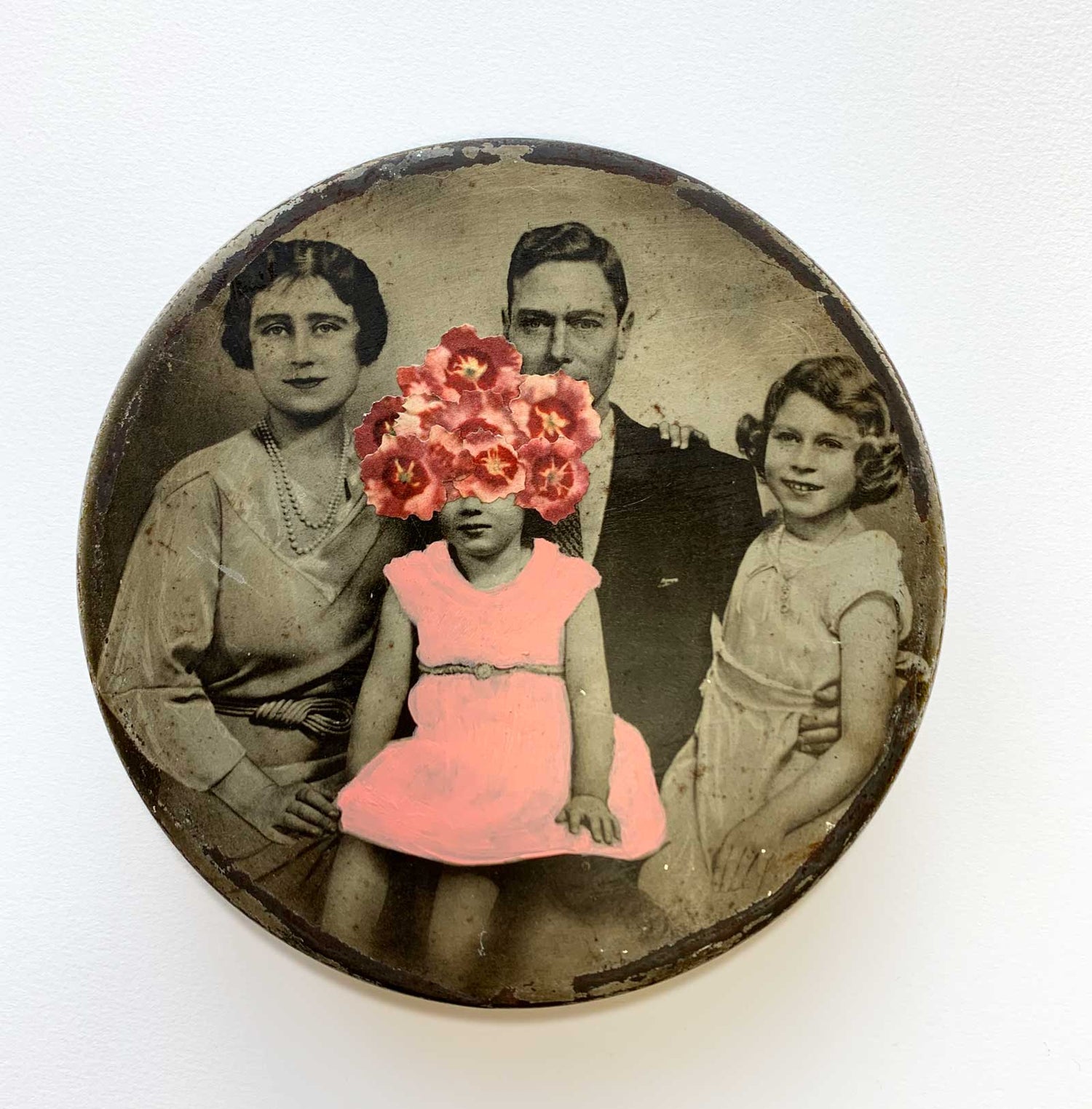 This unique original one-off collage is made with old vintage tin box from 1930s with litho of Royal family Duke of York, Duchess of York, Princess Elizabeth and Princess Margareth.